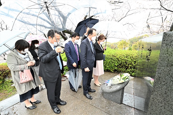 大会当日、方相逸・神日本大陸会長夫妻らが文総裁が初来日された旧下関港付近が眺望できる日和山公園にある崑崙丸沈没犠牲者の慰霊碑に立ち寄られ、犠牲になられたかたがたに慰霊の祈りをささげました。