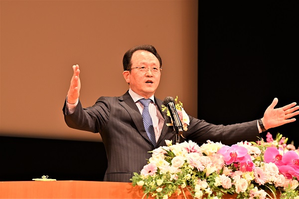 方相逸大陸会長は講演で、自身の韓日祝福結婚の体験を交えながら、力強く文総裁の業績を証ししました。方会長は最後に「山口の下関は聖地と同等の場所です」と祝祷をささげ、参加者にとって感慨深い日臨節80周年記念大会となりました。