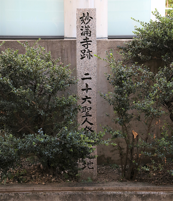 そこから50メートルほど歩いた通りの角に「妙満寺跡 二十六聖人発祥之地」の石碑が立つ。