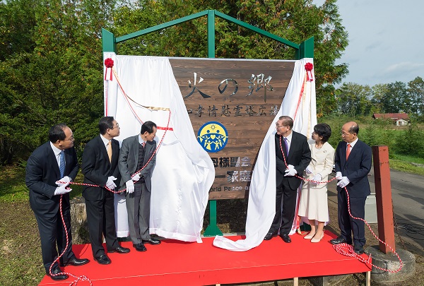 本式典に先立って、聖火の郷の「世界平和孝情慰霊塔広場」の入り口に新たな看板が建てられ、除幕式が行われました。